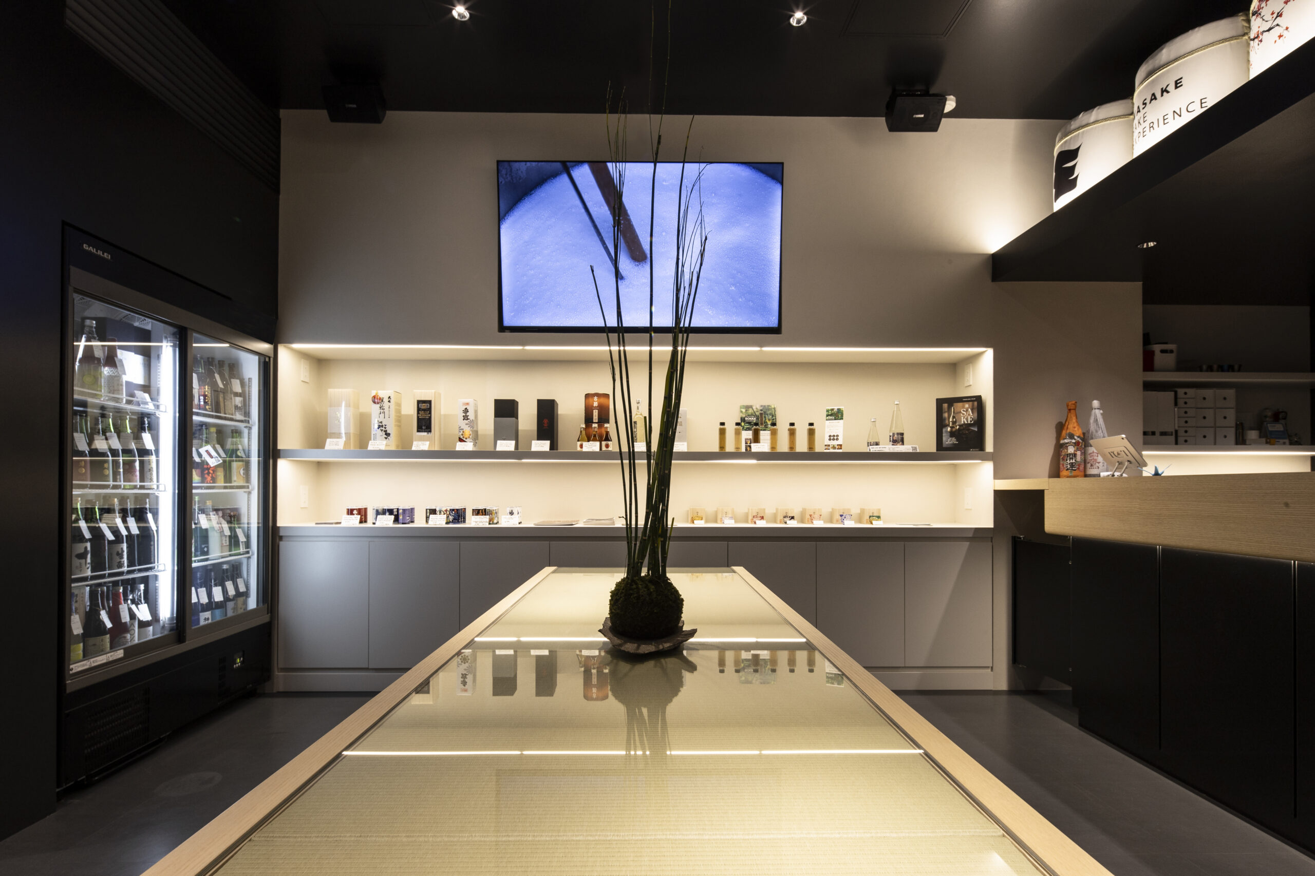 店内中央に配置された畳のテーブルの上には、透明な天板を敷いています。これは畳に付着しそうな汚れを防止するという役割と、お酒がまるで座っているように見せるという、遊び心も取り入れています。また、ここで試飲をする人が和の雰囲気を感じられる写真を撮影できるようにする、という工夫も凝らしています。